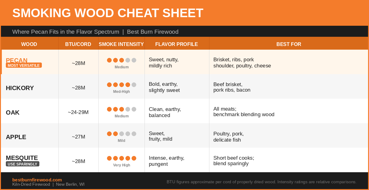 One thing worth clearing up before you buy: pecan has picked up a reputation in certain BBQ circles as a "cool burning" wood. That is not accurate. It burns hot, produces good coals, and behaves exactly the way you would expect from a dense hardwood. The "cool" label likely came from someone comparing it to full-strength hickory or mesquite and noting the milder smoke output, not the heat output.